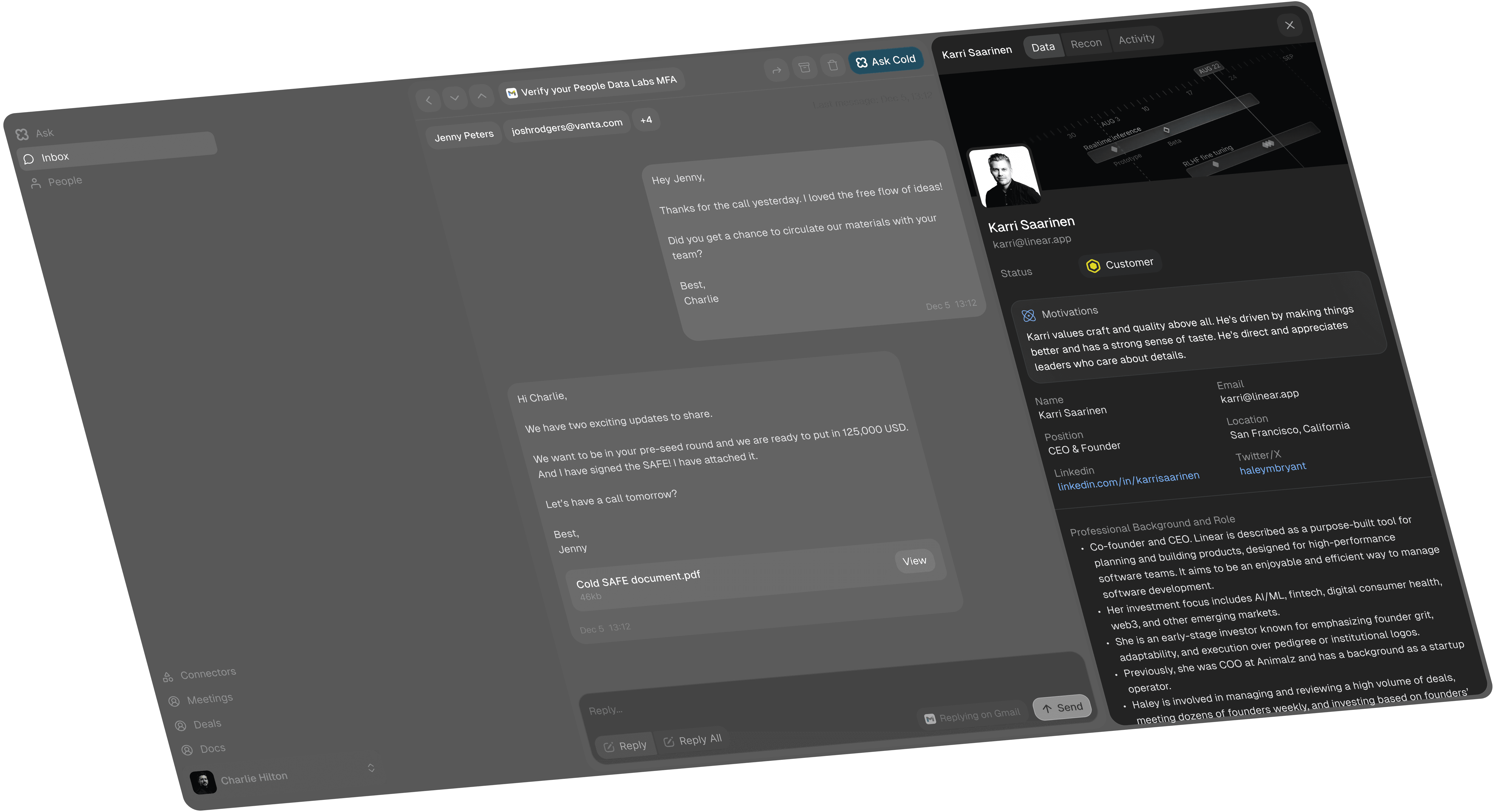 Cold handles work across your inboxes, calendars, CRMs, and documents. Search, act, and automate tasks so you can grow your company with full focus.